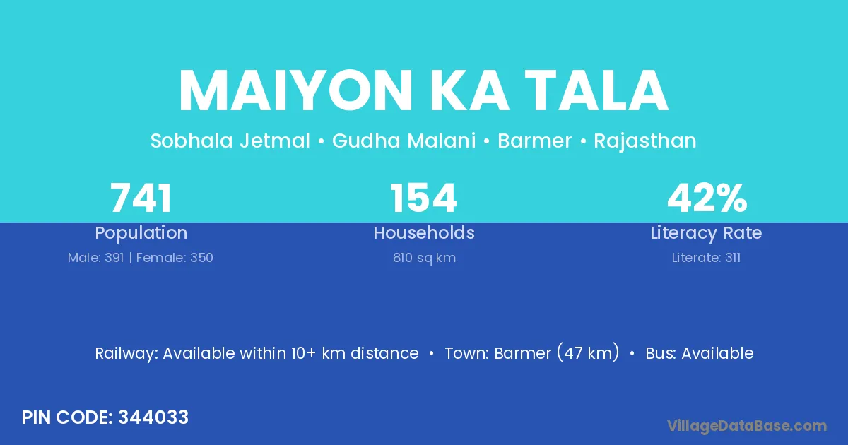 Barmer (47 km) is the nearest town to Maiyon Ka Tala village for major economic activities and is located approximately 47 km away.