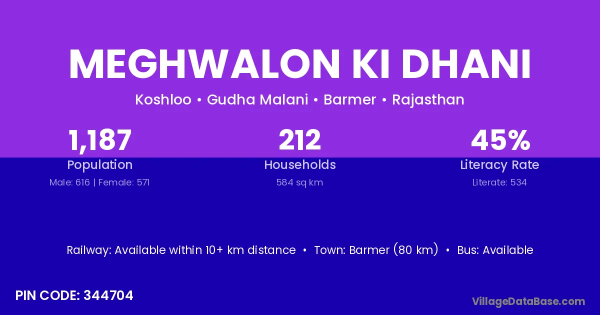 Barmer (80 km) is the nearest town to Meghwalon Ki Dhani village for major economic activities and is located approximately 80 km away.