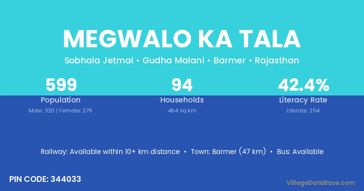 Barmer (47 km) is the nearest town to Megwalo Ka Tala village for major economic activities and is located approximately 47 km away.