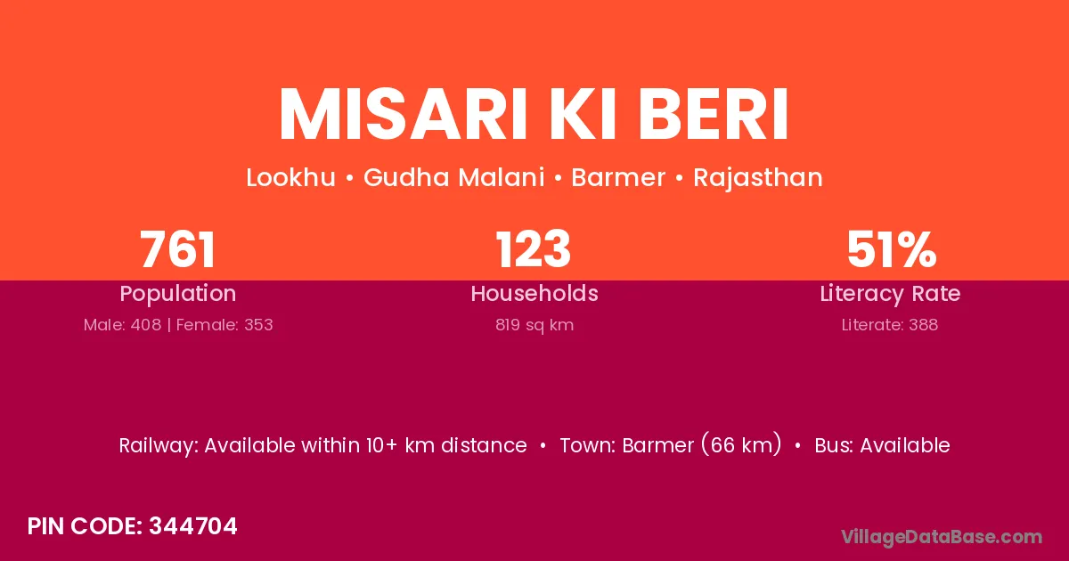 Barmer (66 km) is the nearest town to Misari Ki Beri village for major economic activities and is located approximately 66 km away.