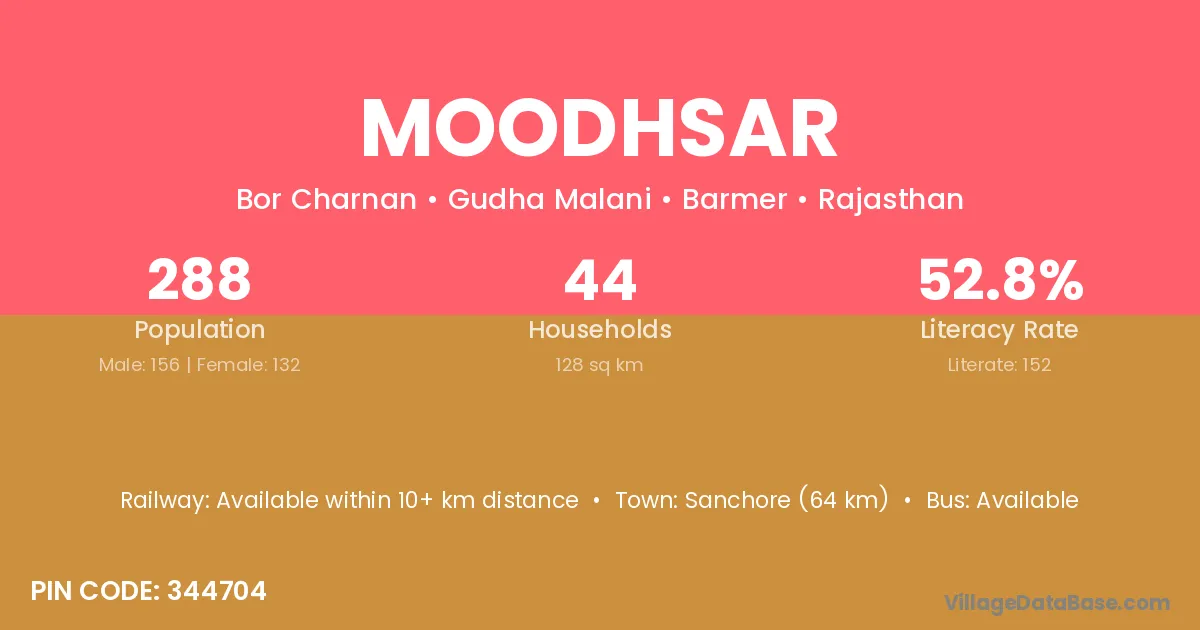 Sanchore (64 km) is the nearest town to Moodhsar village for major economic activities and is located approximately 64 km away.