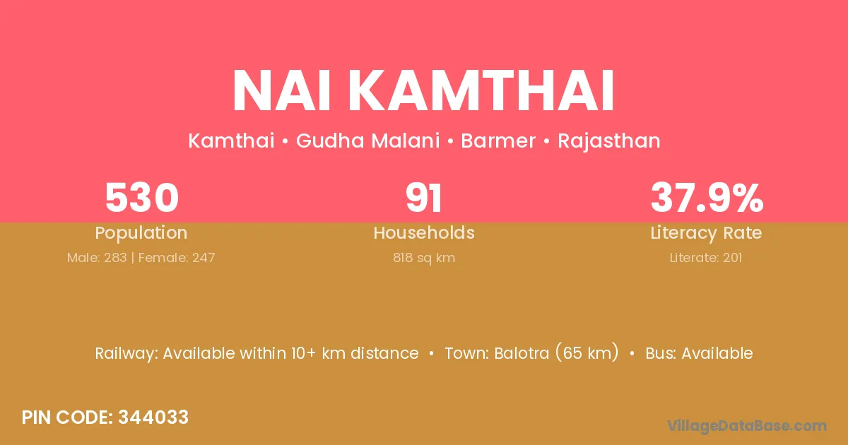 Balotra (65 km) is the nearest town to Nai Kamthai village for major economic activities and is located approximately 65 km away.