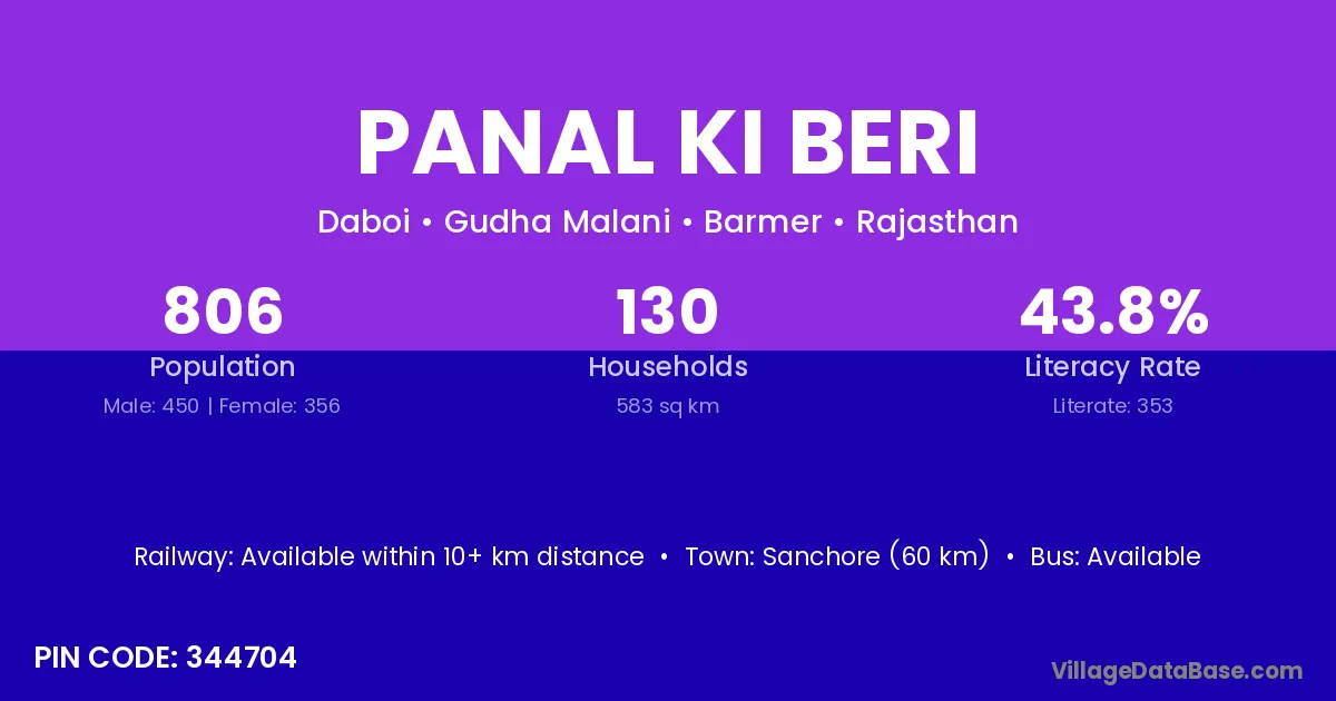 Sanchore (60 km) is the nearest town to Panal Ki Beri village for major economic activities and is located approximately 60 km away.
