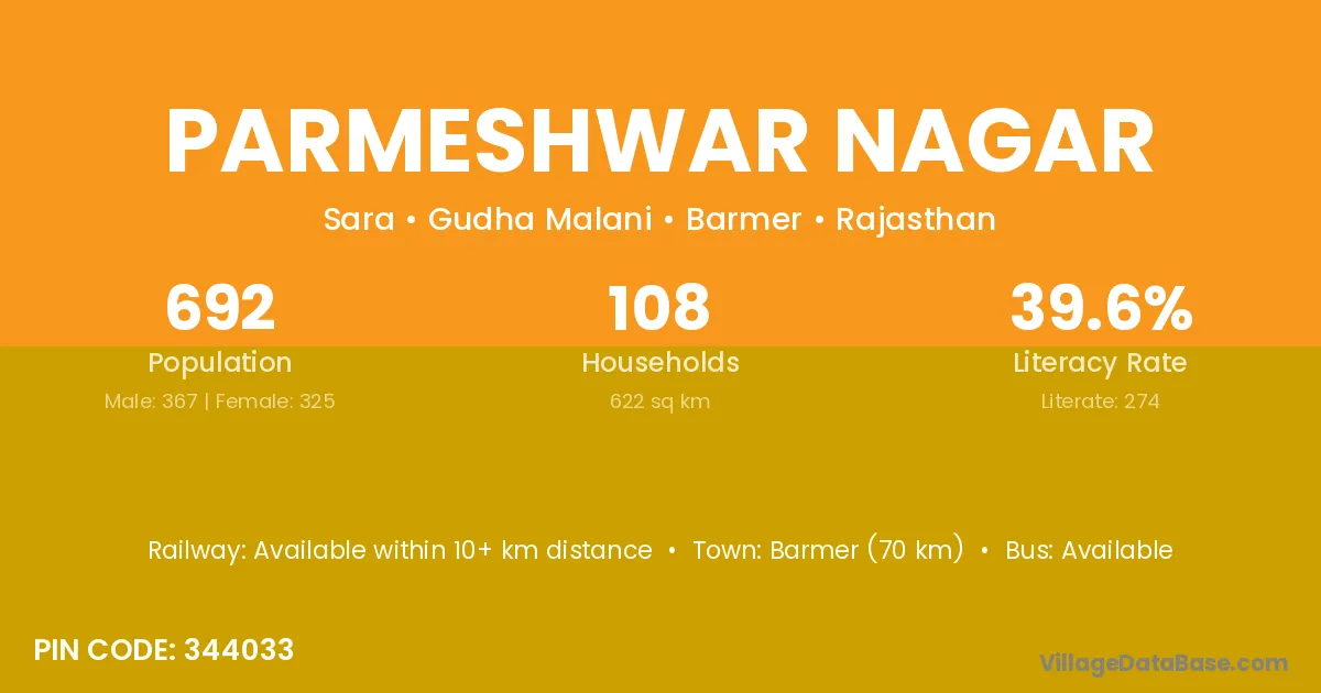 Barmer (70 km) is the nearest town to Parmeshwar Nagar village for major economic activities and is located approximately 70 km away.