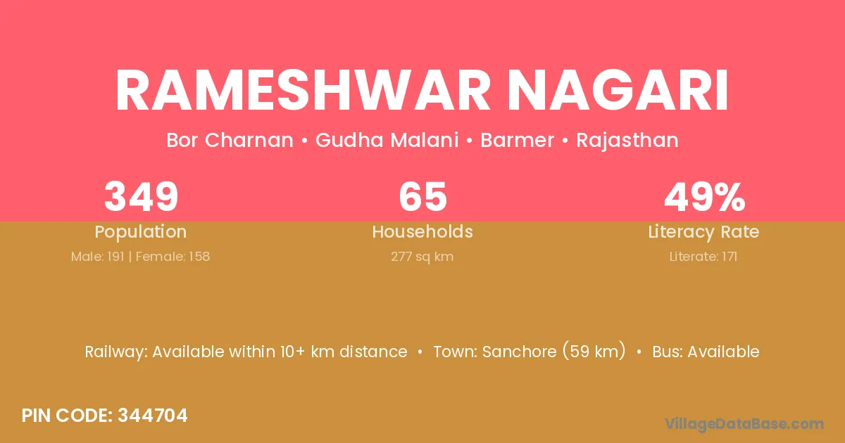 Sanchore (59 km) is the nearest town to Rameshwar Nagari village for major economic activities and is located approximately 59 km away.