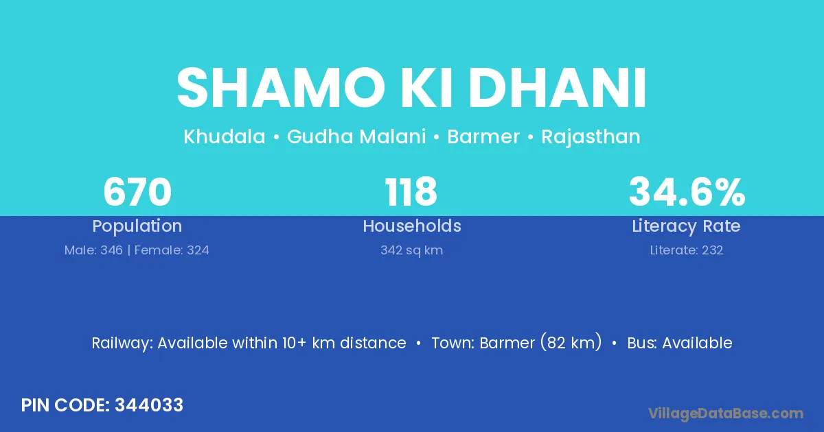 Barmer (82 km) is the nearest town to Shamo Ki Dhani village for major economic activities and is located approximately 82 km away.