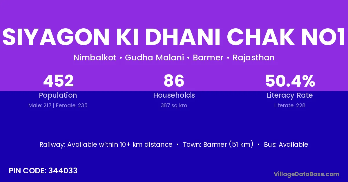 Siyagon Ki Dhani Chak No1 village has a total population of 452 people, of which 217 are males and 235 are females.