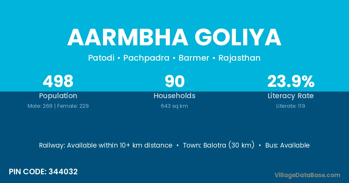 Balotra (30 km) is the nearest town to Aarmbha Goliya village for major economic activities and is located approximately 30 km away.