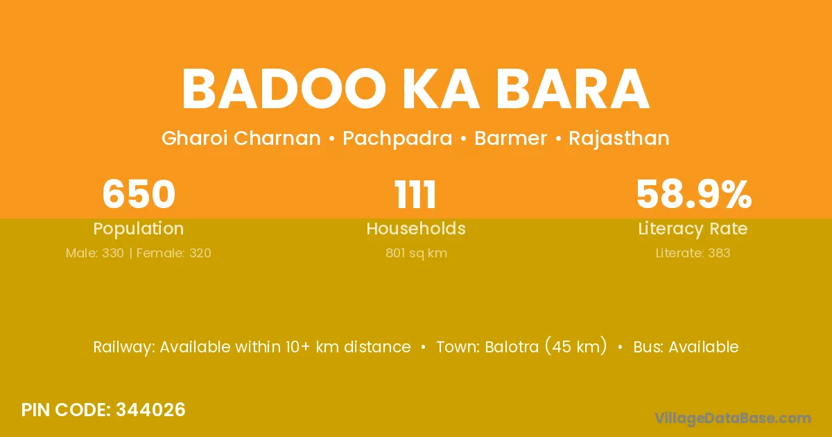 Balotra (45 km) is the nearest town to Badoo Ka Bara village for major economic activities and is located approximately 45 km away.