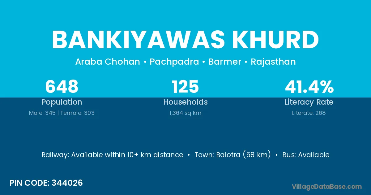 Balotra (58 km) is the nearest town to Bankiyawas Khurd village for major economic activities and is located approximately 58 km away.