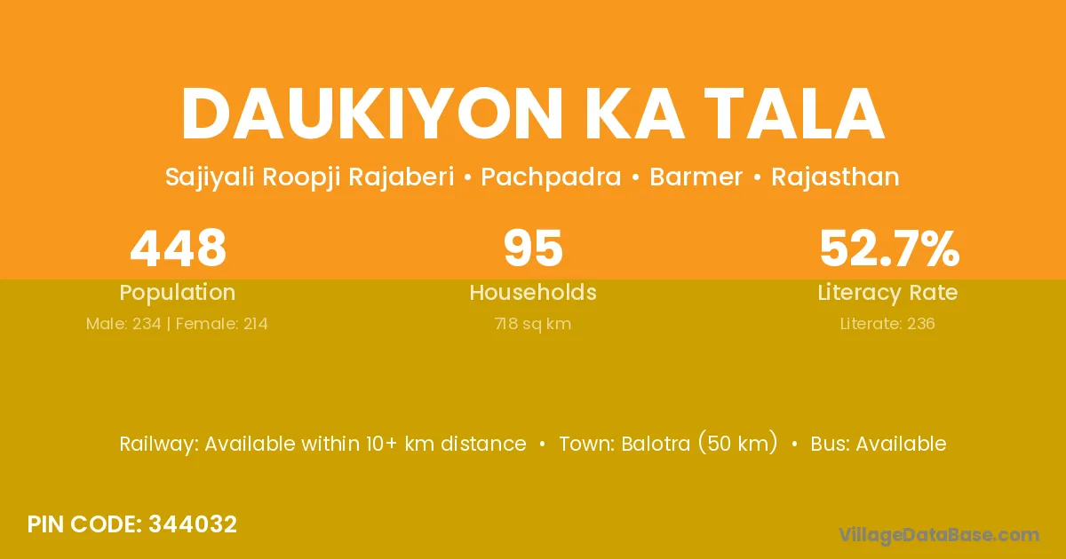 Balotra (50 km) is the nearest town to Daukiyon Ka Tala village for major economic activities and is located approximately 50 km away.