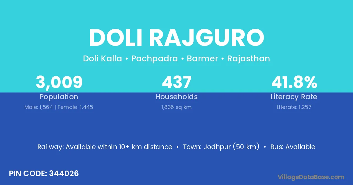 Jodhpur (50 km) is the nearest town to Doli Rajguro village for major economic activities and is located approximately 50 km away.