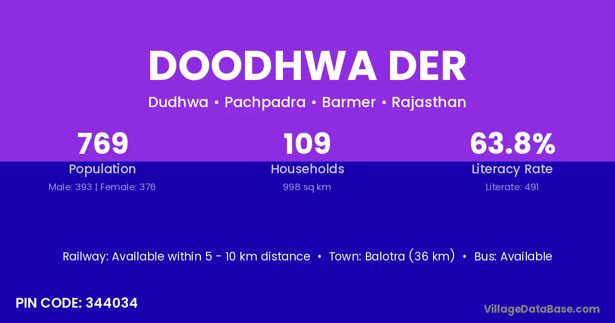 Balotra (36 km) is the nearest town to Doodhwa Der village for major economic activities and is located approximately 36 km away.