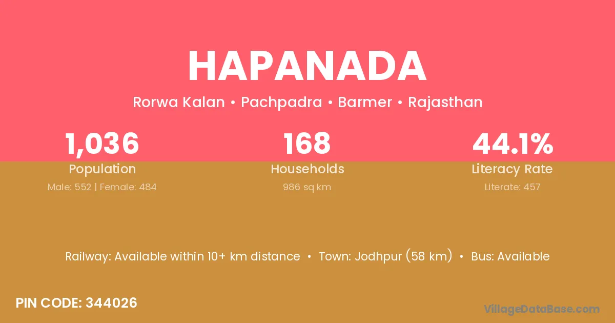 Jodhpur (58 km) is the nearest town to Hapanada village for major economic activities and is located approximately 58 km away.
