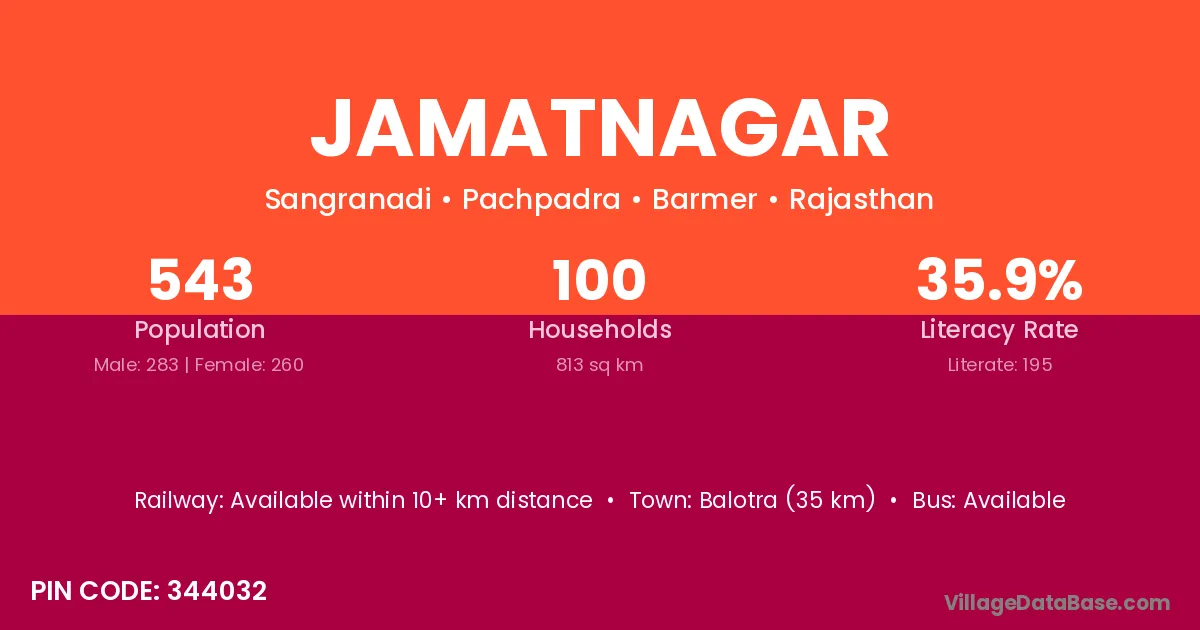 Balotra (35 km) is the nearest town to Jamatnagar village for major economic activities and is located approximately 35 km away.