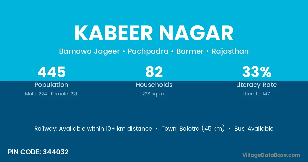 Balotra (45 km) is the nearest town to Kabeer Nagar village for major economic activities and is located approximately 45 km away.