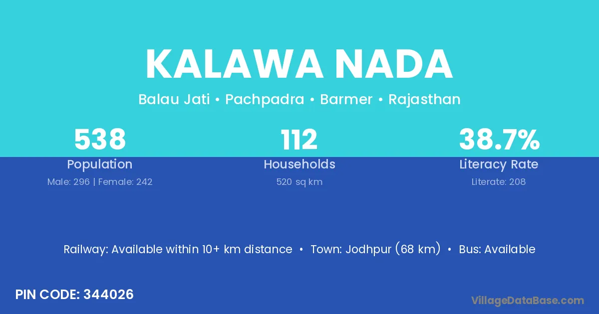 Jodhpur (68 km) is the nearest town to Kalawa Nada village for major economic activities and is located approximately 68 km away.