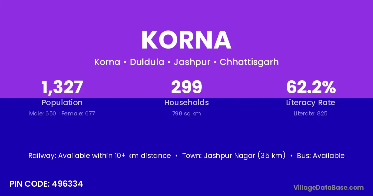 Korna village has a total population of 2,634 people, of which 1,395 are males and 1,239 are females.