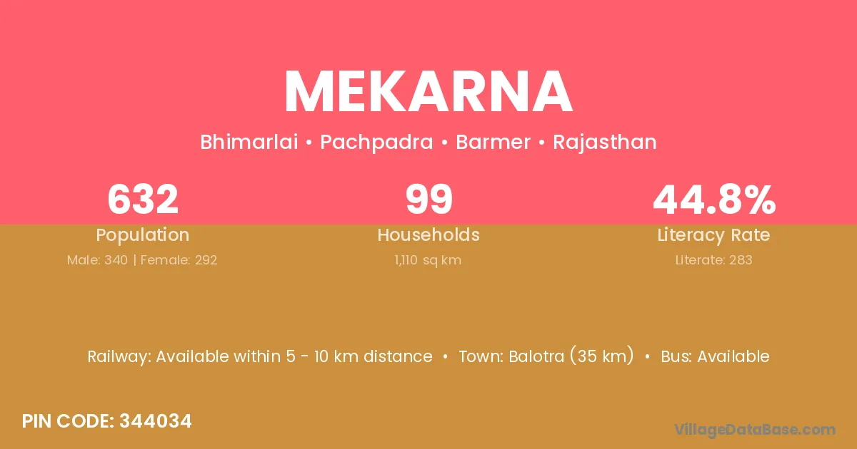 Balotra (35 km) is the nearest town to Mekarna village for major economic activities and is located approximately 35 km away.