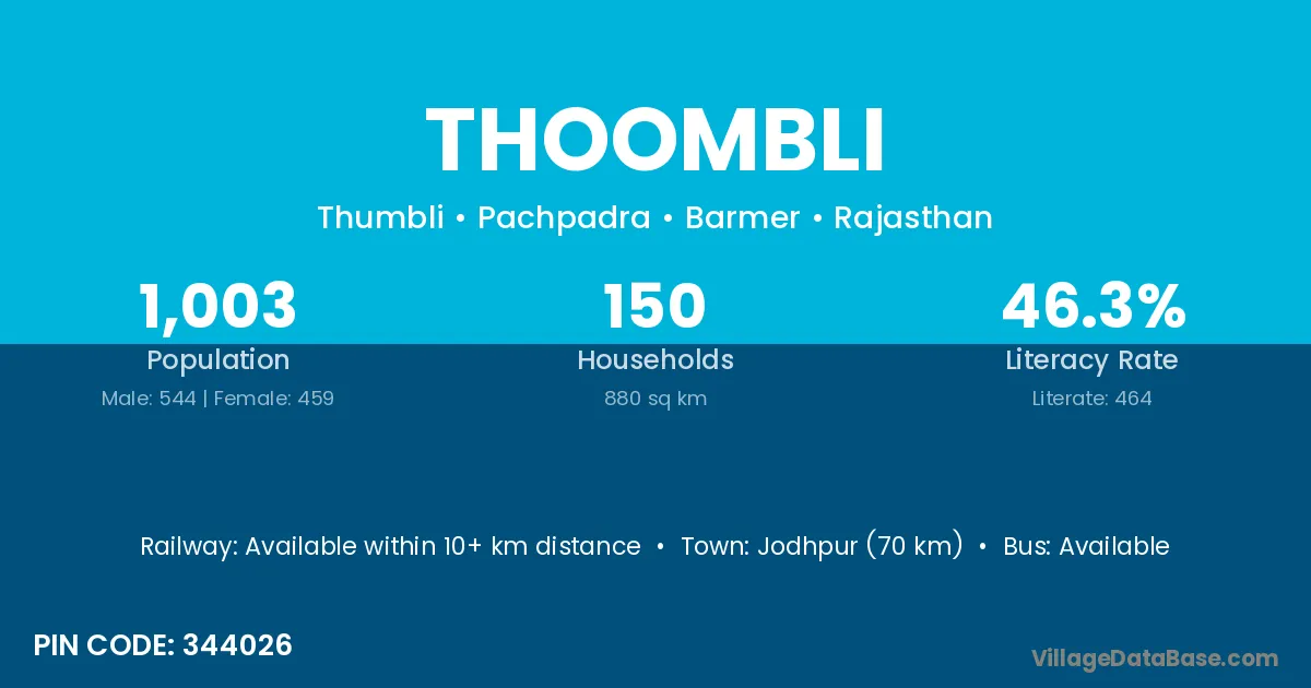 Jodhpur (70 km) is the nearest town to Thoombli village for major economic activities and is located approximately 70 km away.
