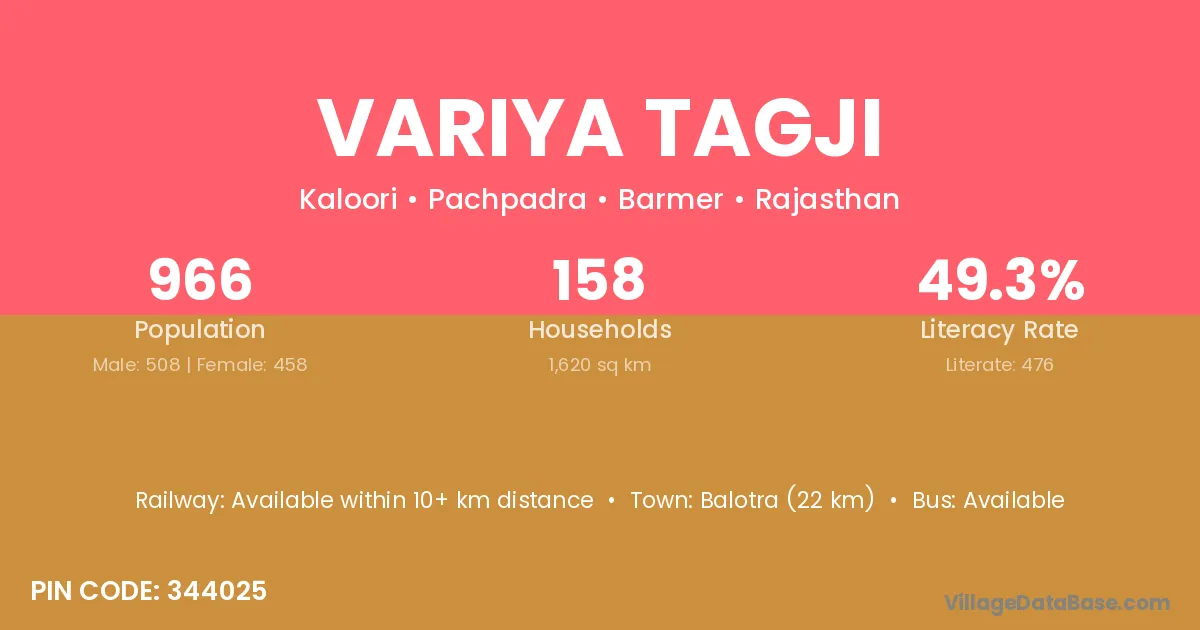 Balotra (22 km) is the nearest town to Variya Tagji village for major economic activities and is located approximately 22 km away.