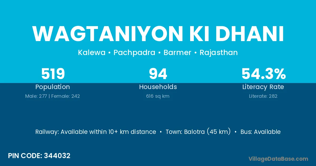 Balotra (45 km) is the nearest town to Wagtaniyon Ki Dhani village for major economic activities and is located approximately 45 km away.