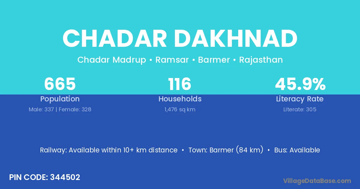 Barmer (84 km) is the nearest town to Chadar Dakhnad village for major economic activities and is located approximately 84 km away.