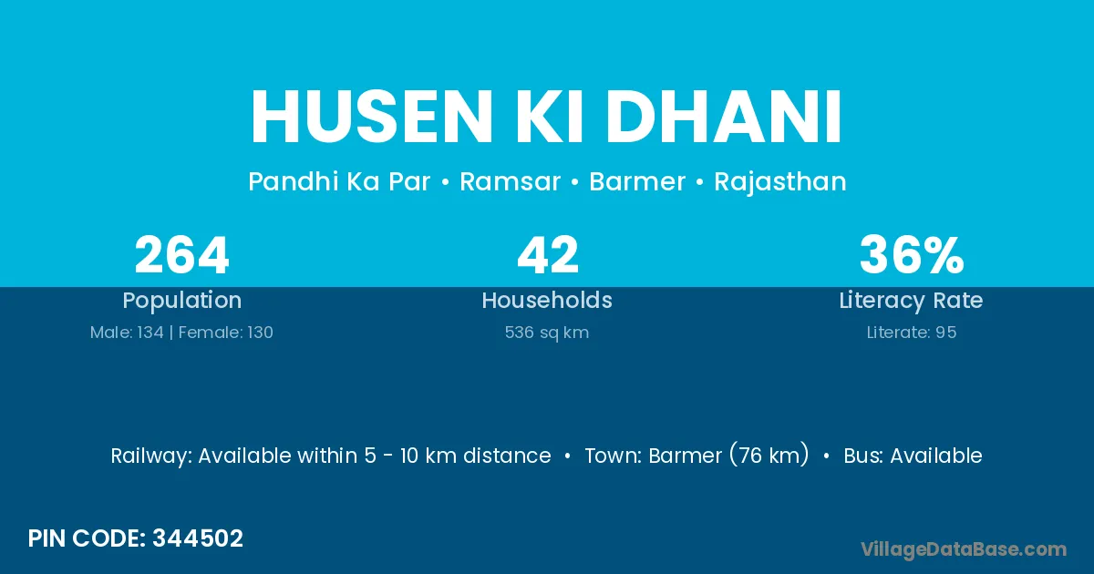 Barmer (76 km) is the nearest town to Husen Ki Dhani village for major economic activities and is located approximately 76 km away.