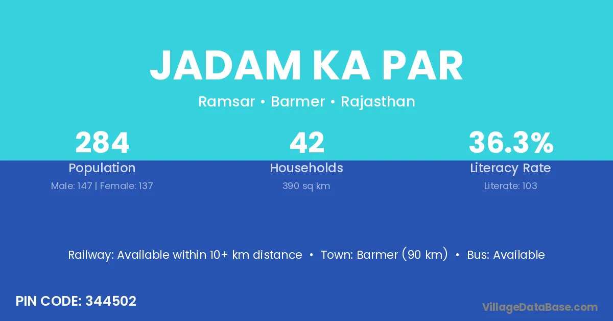 Barmer (90 km) is the nearest town to Jadam Ka Par village for major economic activities and is located approximately 90 km away.