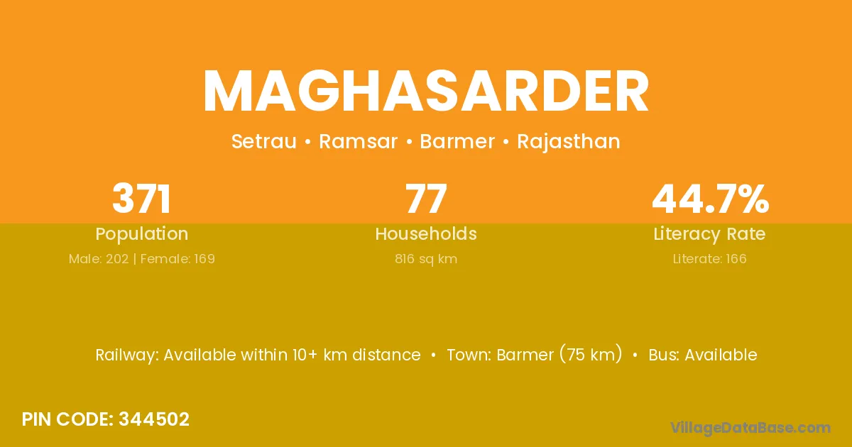 Barmer (75 km) is the nearest town to Maghasarder village for major economic activities and is located approximately 75 km away.