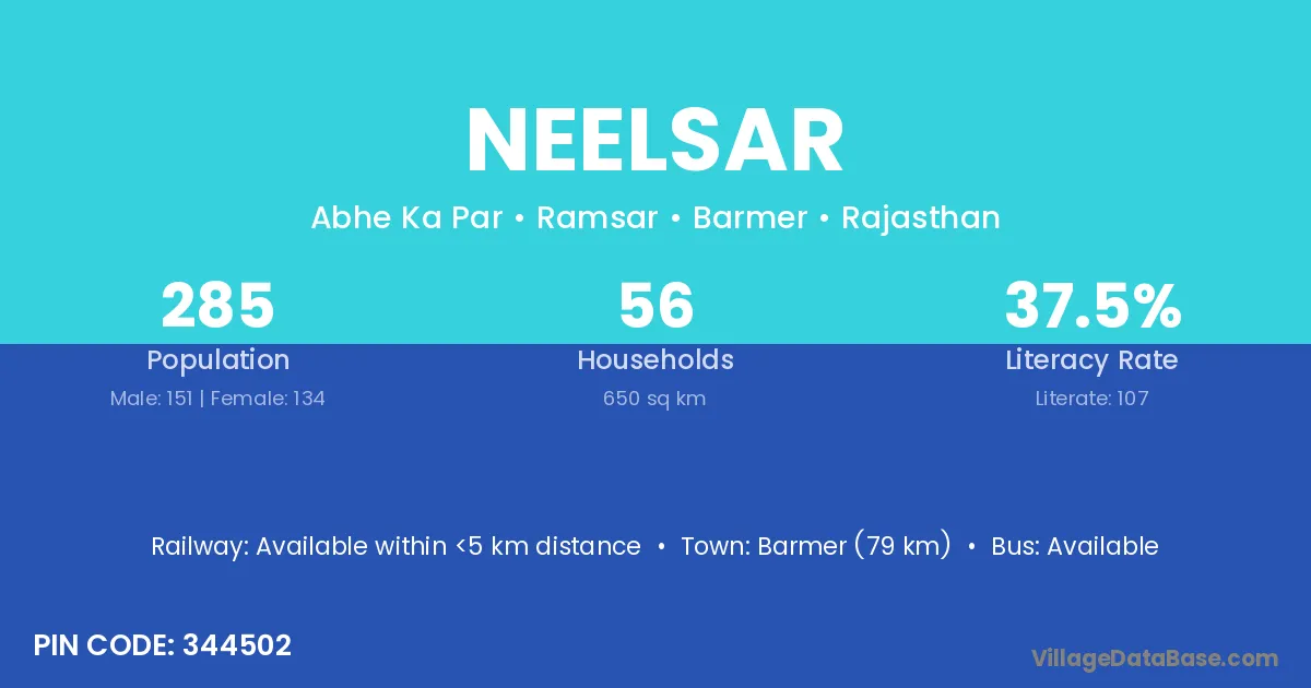 Barmer (79 km) is the nearest town to Neelsar village for major economic activities and is located approximately 79 km away.