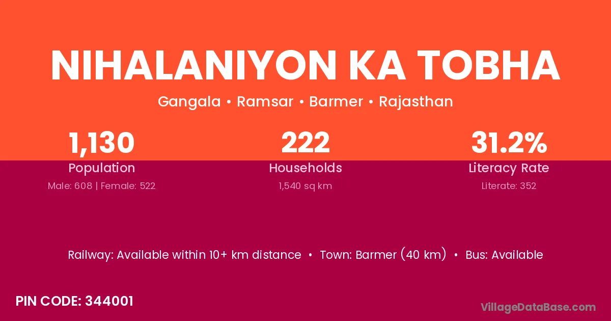 Nihalaniyon Ka Tobha village has a total population of 1,130 people, of which 608 are males and 522 are females.