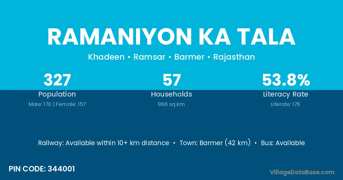 Barmer (42 km) is the nearest town to Ramaniyon Ka Tala village for major economic activities and is located approximately 42 km away.