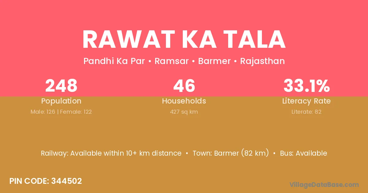 Rawat Ka Tala village has a total population of 248 people, of which 126 are males and 122 are females.