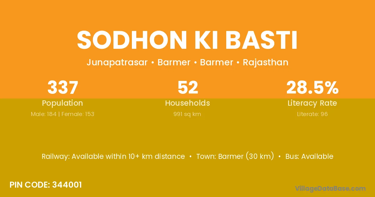 Barmer (40 km) is the nearest town to Sodhon Ki Basti village for major economic activities and is located approximately 40 km away.