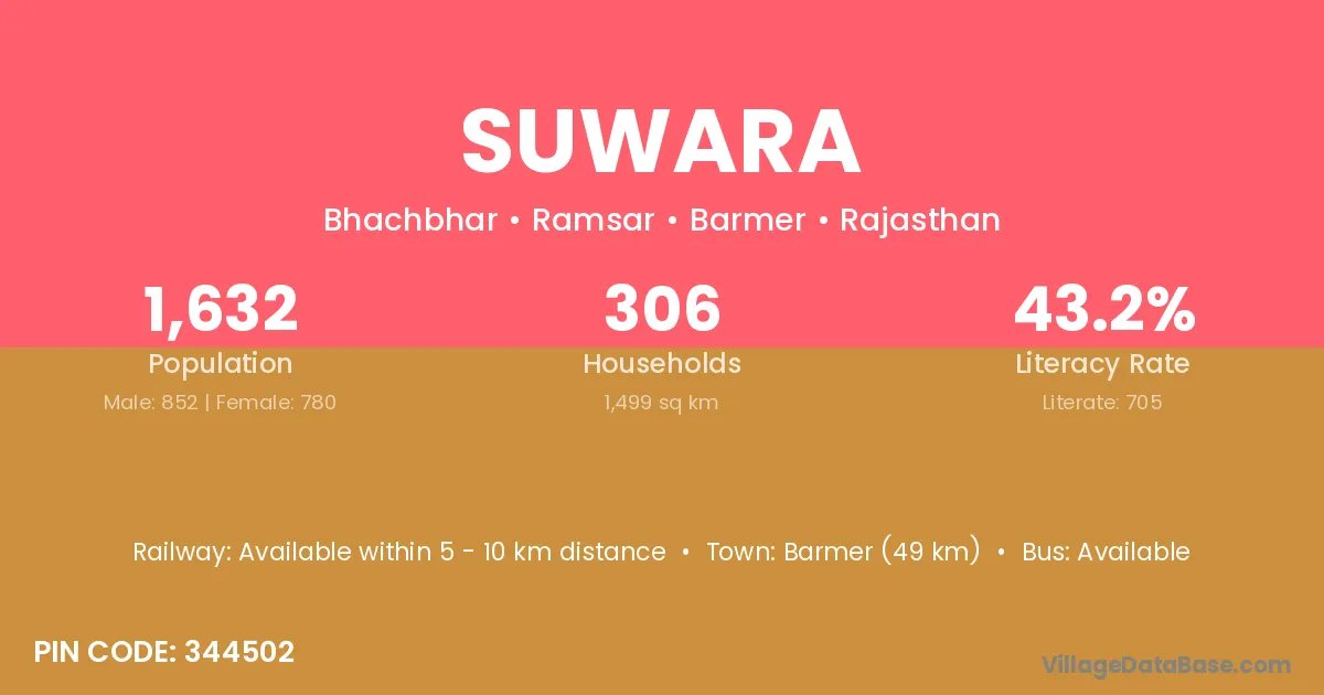 Barmer (49 km) is the nearest town to Suwara village for major economic activities and is located approximately 49 km away.