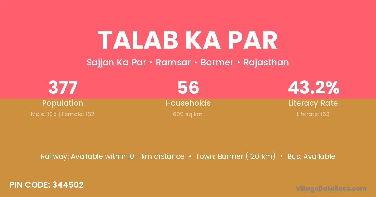Barmer (120 km) is the nearest town to Talab Ka Par village for major economic activities and is located approximately 120 km away.