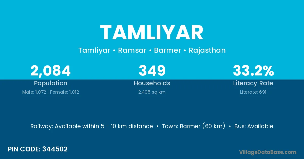 Barmer (60 km) is the nearest town to Tamliyar village for major economic activities and is located approximately 60 km away.
