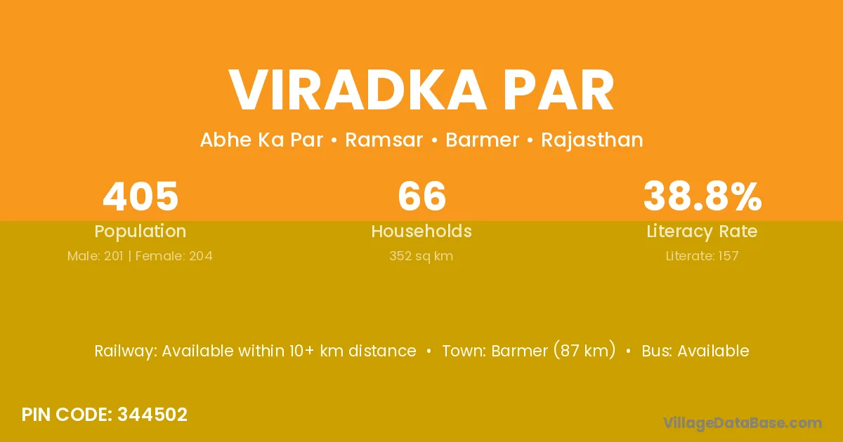 Barmer (87 km) is the nearest town to Viradka Par village for major economic activities and is located approximately 87 km away.