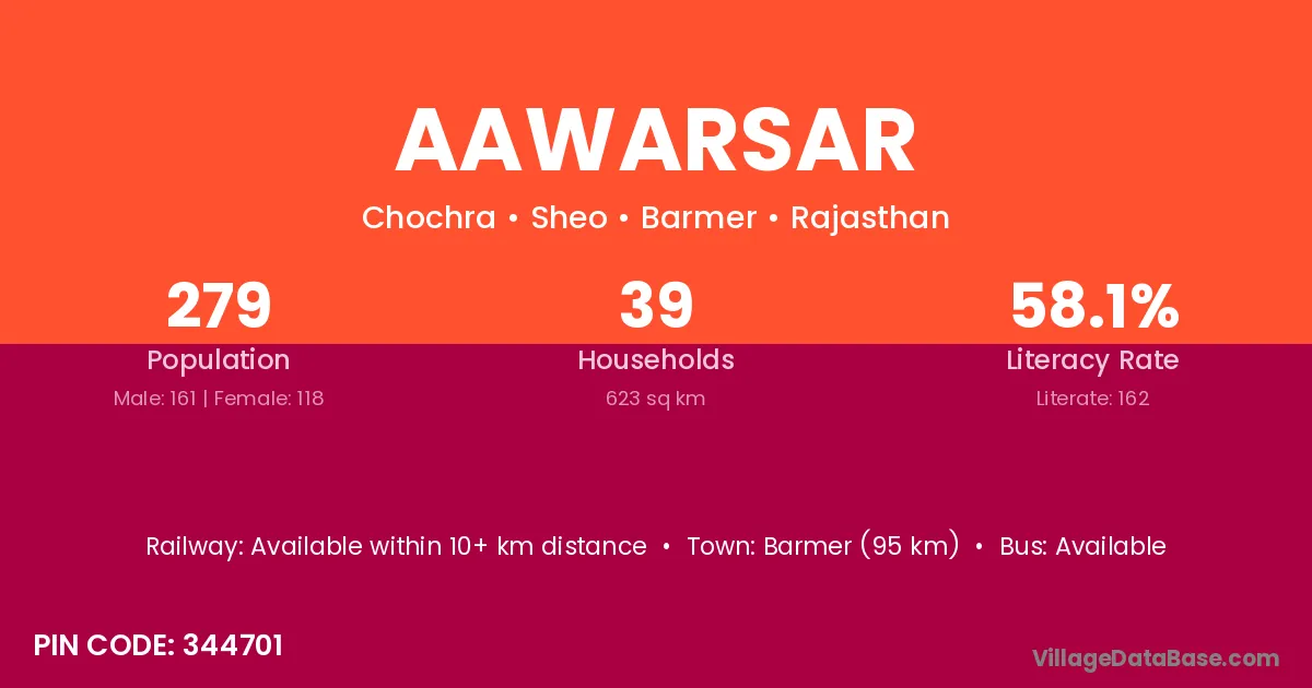 Barmer (95 km) is the nearest town to Aawarsar village for major economic activities and is located approximately 95 km away.
