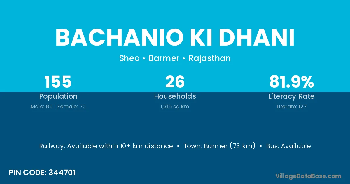 Barmer (73 km) is the nearest town to Bachanio Ki Dhani village for major economic activities and is located approximately 73 km away.