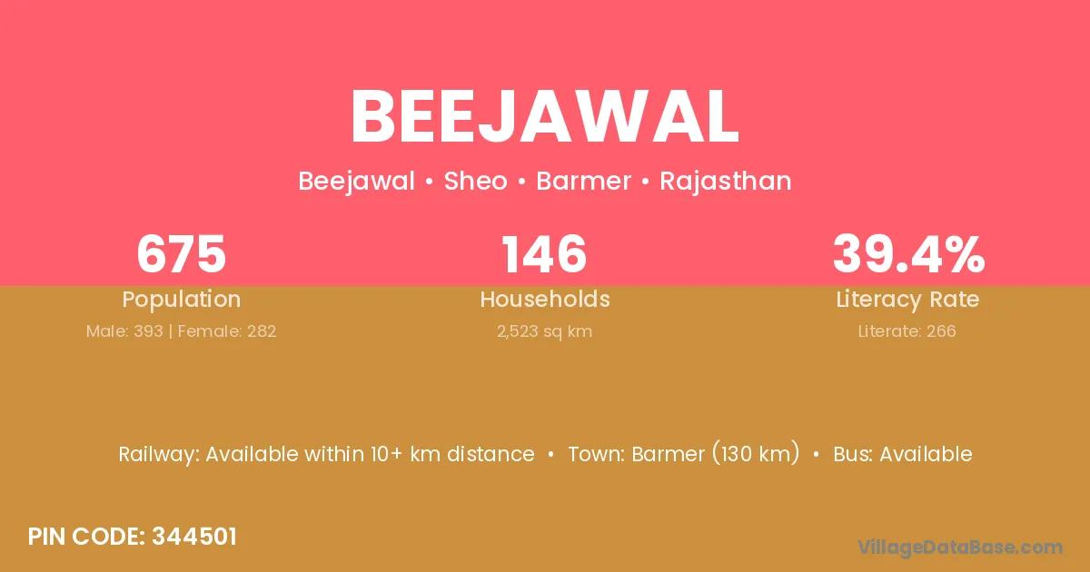 Barmer (130 km) is the nearest town to Beejawal village for major economic activities and is located approximately 130 km away.