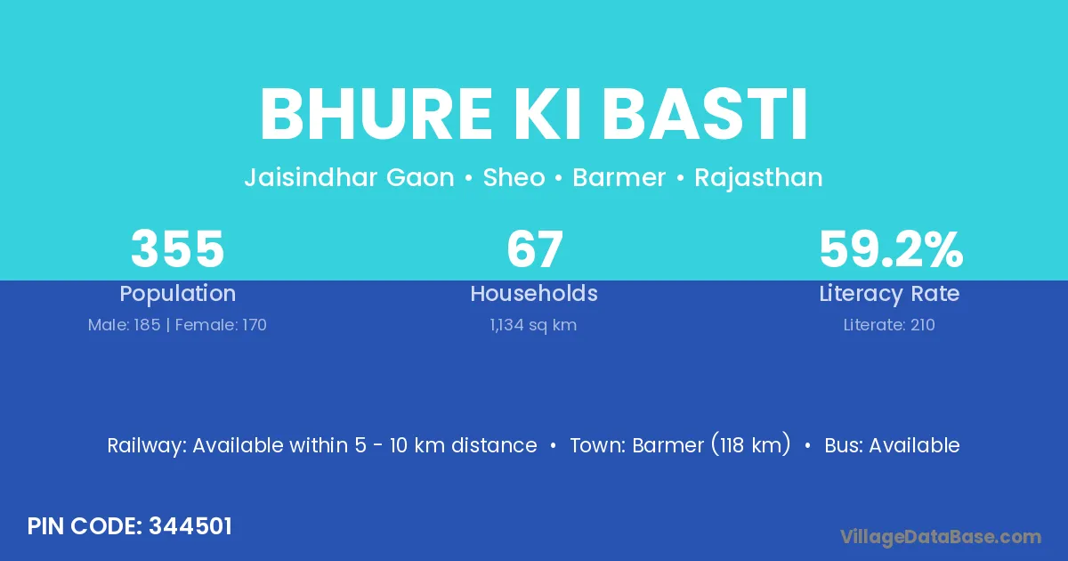 Barmer (118 km) is the nearest town to Bhure Ki Basti village for major economic activities and is located approximately 118 km away.