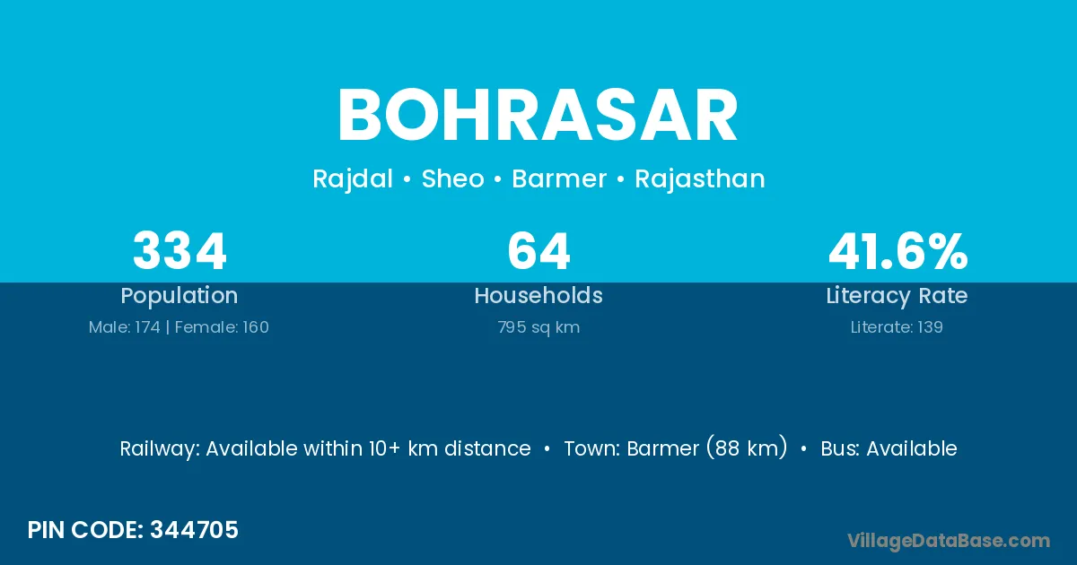 Barmer (88 km) is the nearest town to Bohrasar village for major economic activities and is located approximately 88 km away.