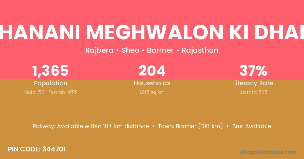 Dhanani Meghwalon Ki Dhani village has a total population of 1,365 people, of which 710 are males and 655 are females.