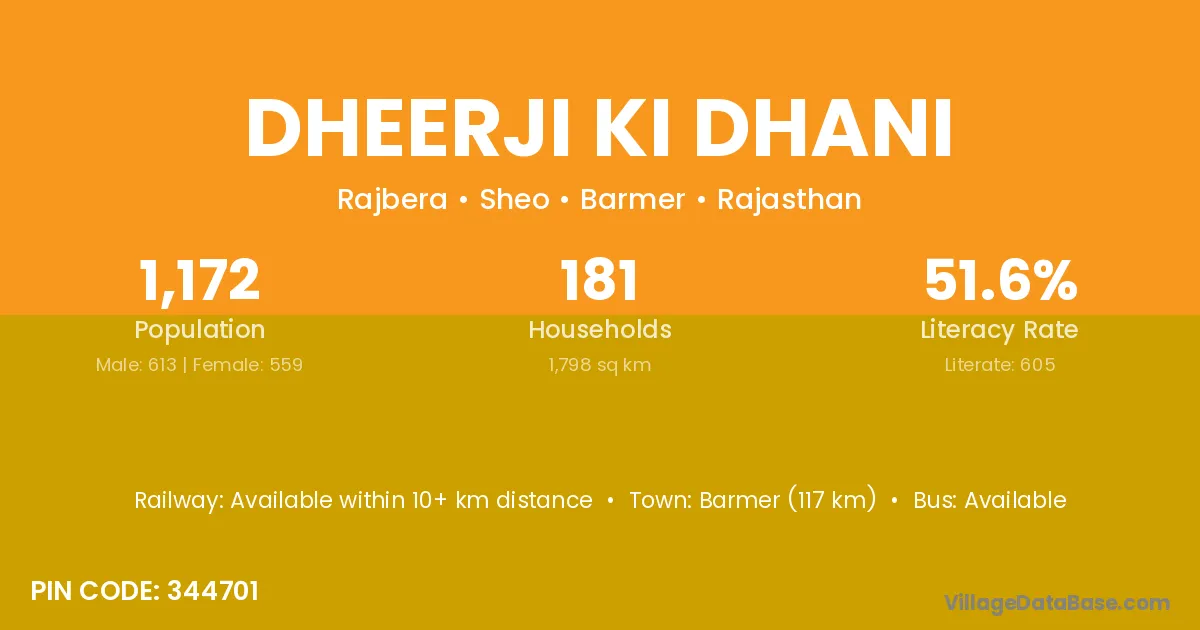 Barmer (117 km) is the nearest town to Dheerji Ki Dhani village for major economic activities and is located approximately 117 km away.