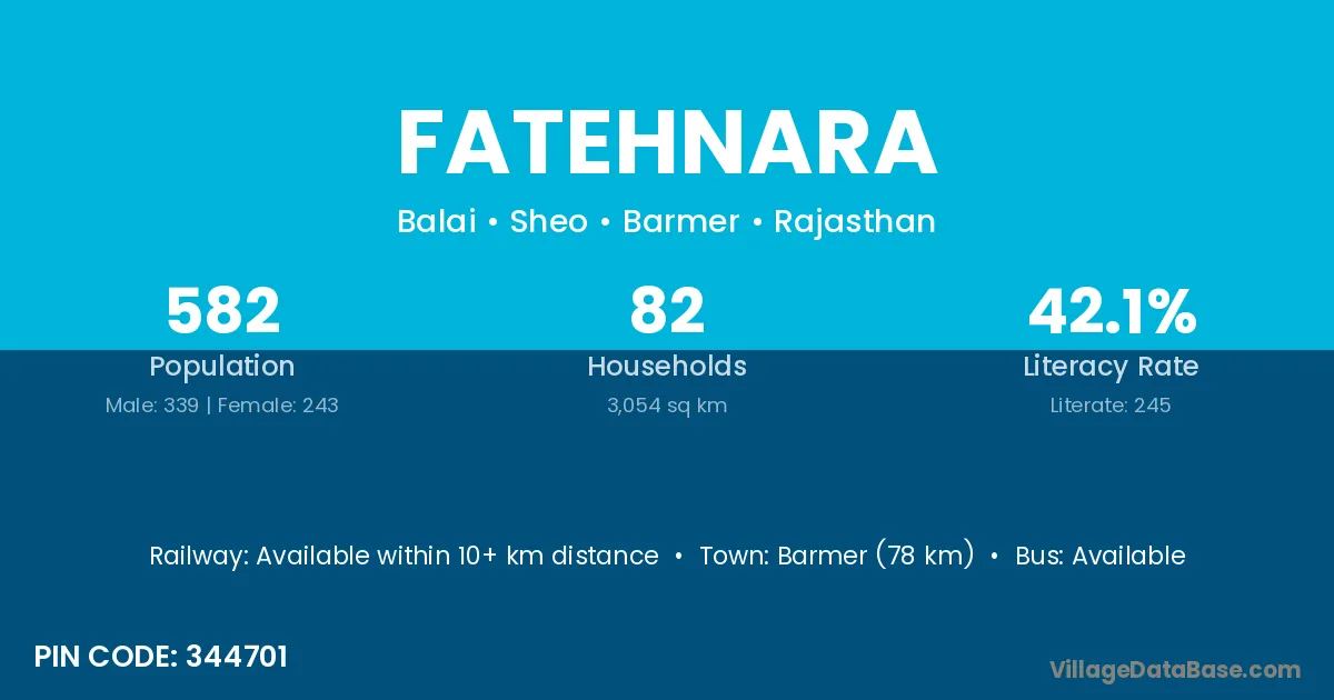 Barmer (78 km) is the nearest town to Fatehnara village for major economic activities and is located approximately 78 km away.