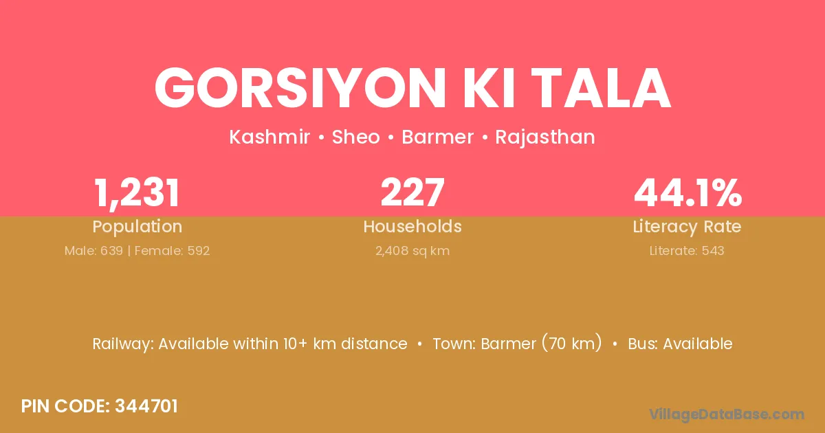 Gorsiyon Ki Tala village has a total population of 1,231 people, of which 639 are males and 592 are females.
