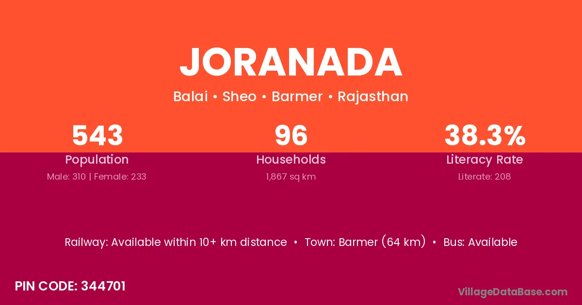 Barmer (64 km) is the nearest town to Joranada village for major economic activities and is located approximately 64 km away.