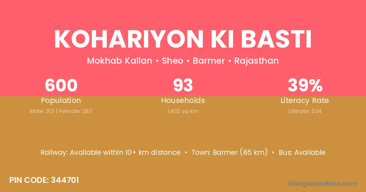 Barmer (65 km) is the nearest town to Kohariyon Ki Basti village for major economic activities and is located approximately 65 km away.